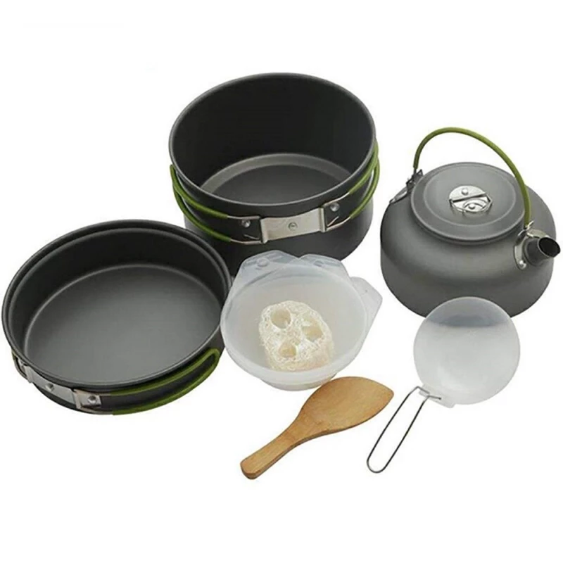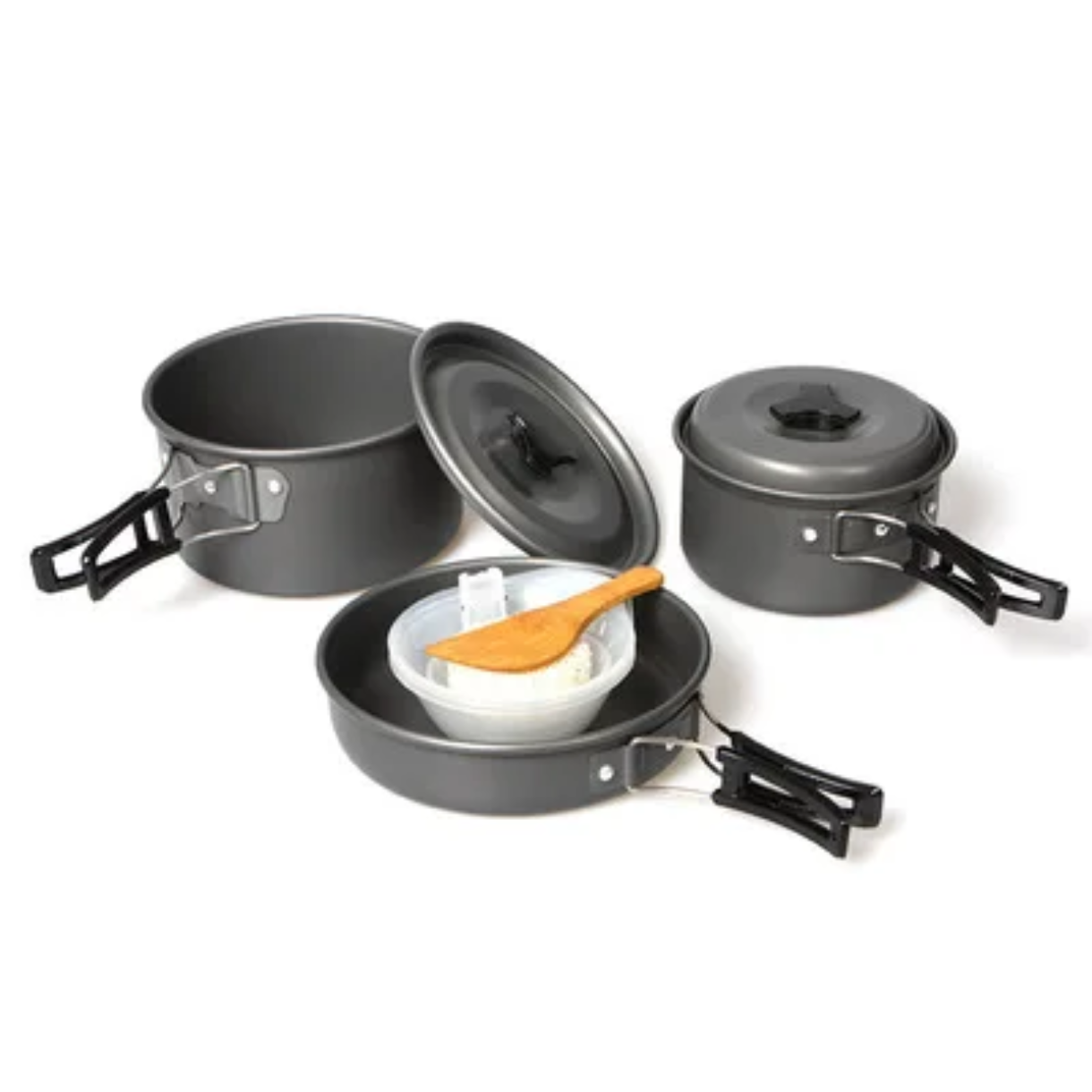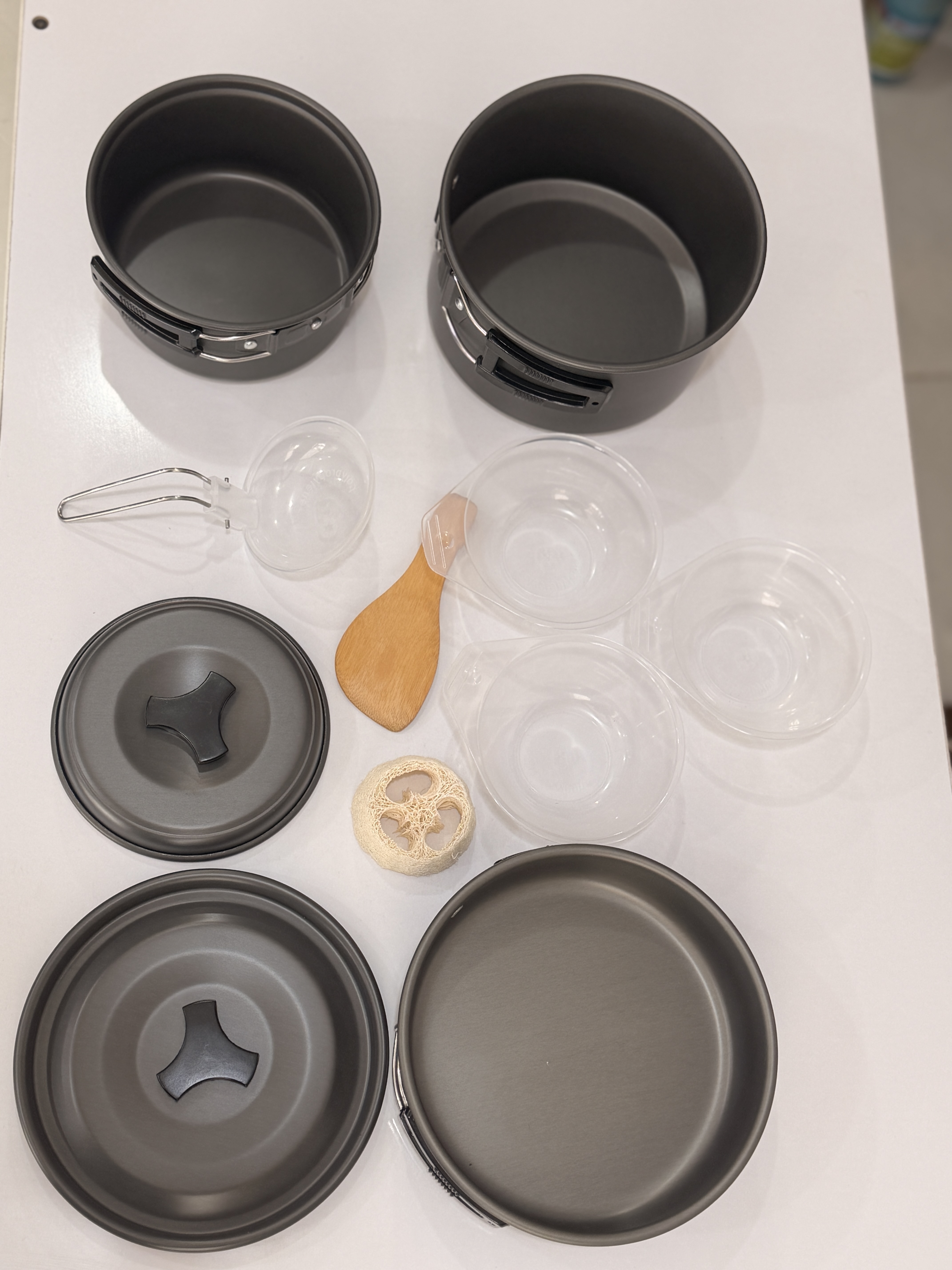 ست شامل قابلمه بزرگ، قابلمه کوچک، ماهیتابه نچسب، کاسههای پلاستیکی، قاشق چوبی، اسفنج شستوشو و کیف توری حمل میباشد 🎒