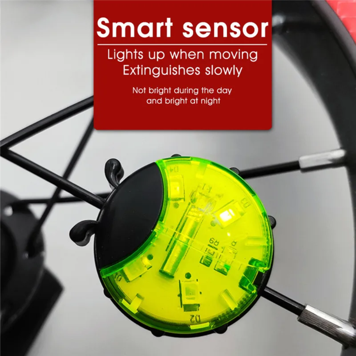 این چراغ رو بین پرههای چرخ دوچرخه نصب میکنی. وقتی دوچرخه شروع به حرکت میکنه، چراغ بهصورت خودکار روشن میشه و وقتی وایمیستی یا دوچرخه تکون نمیخوره، خاموش میشه. یعنی لازم نیست هی با دست روشن و خاموشش کنی — خودش میفهمه! 😄