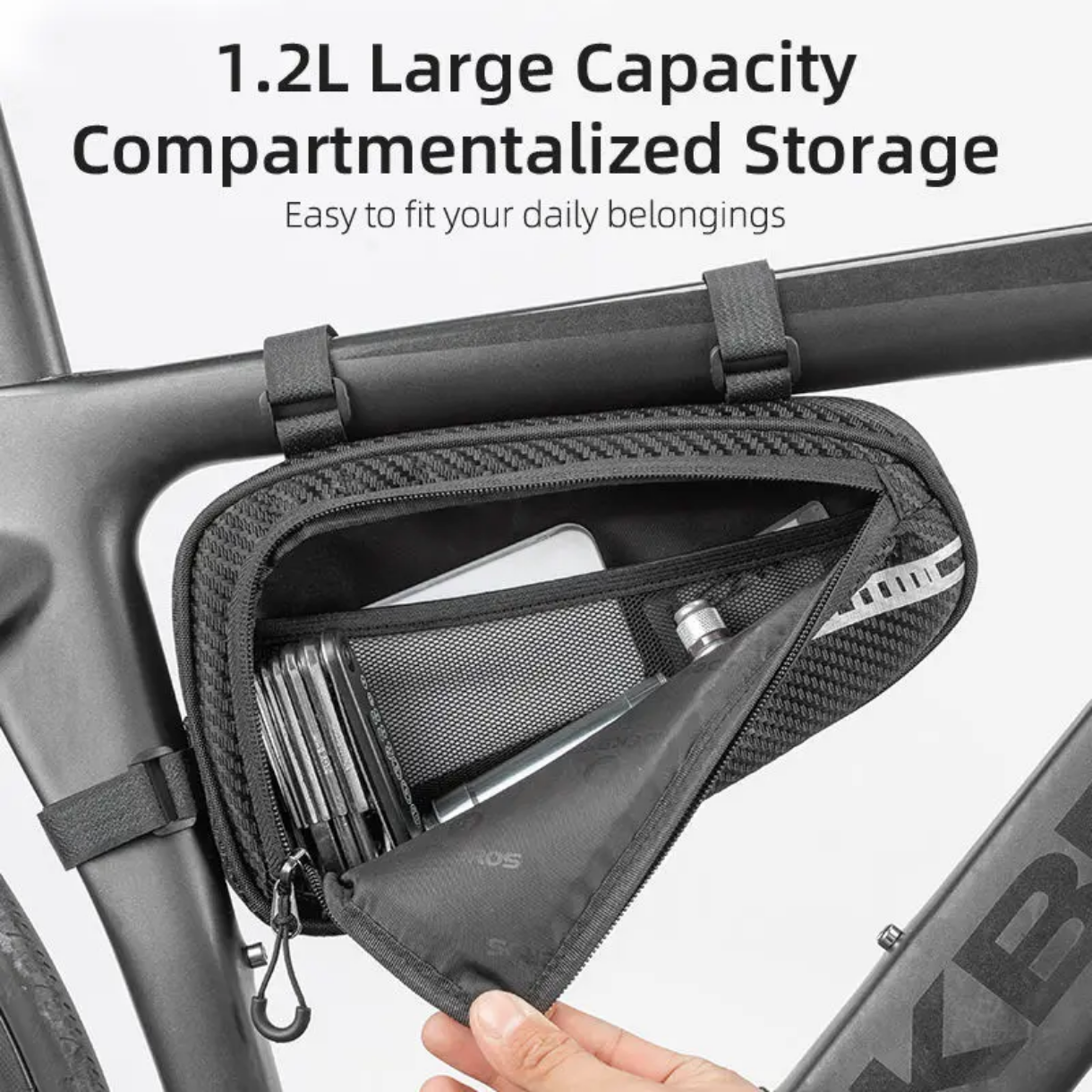 این کیف به شکل مثلث طراحی شده تا بهراحتی روی فریم میانی دوچرخه نصب شود و فضای مناسبی را برای حمل وسایل کوچک فراهم کند.