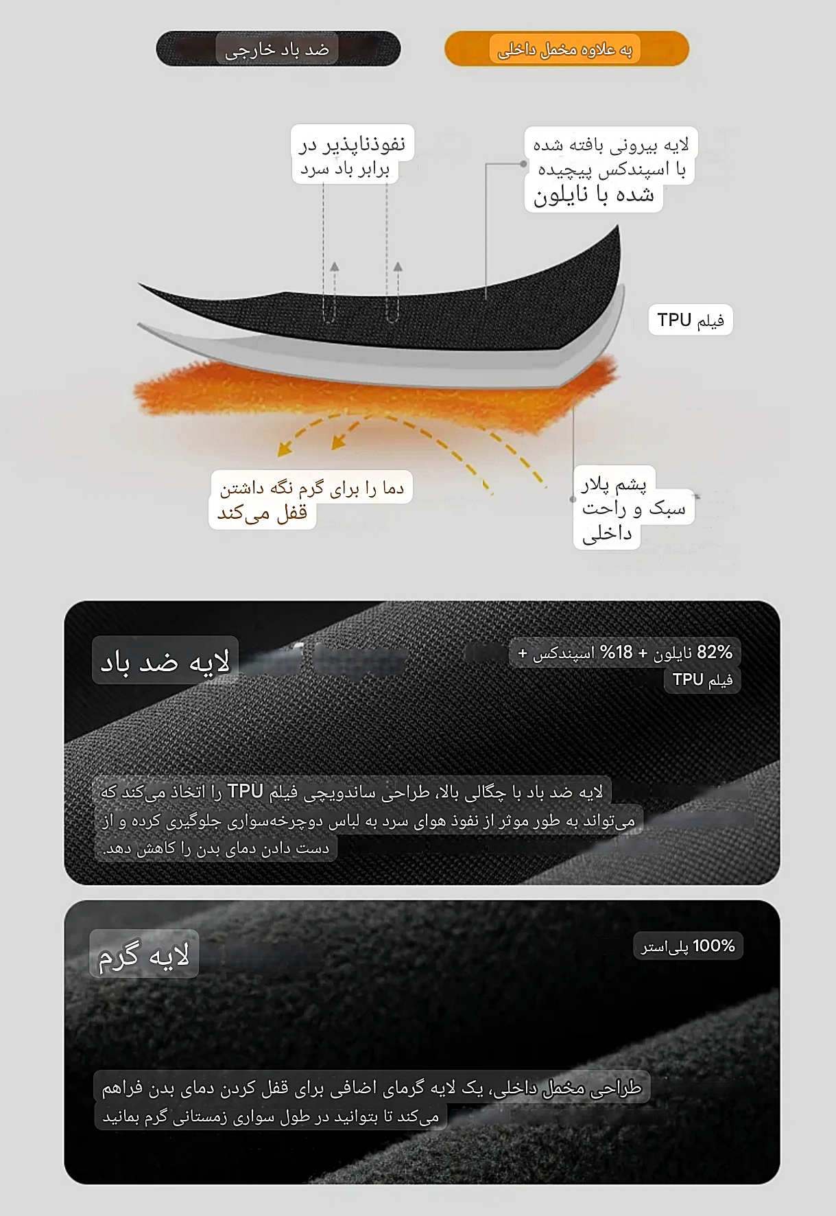 جلوی لباس از لایه ضدباد TPU ساخته شده 🌬️